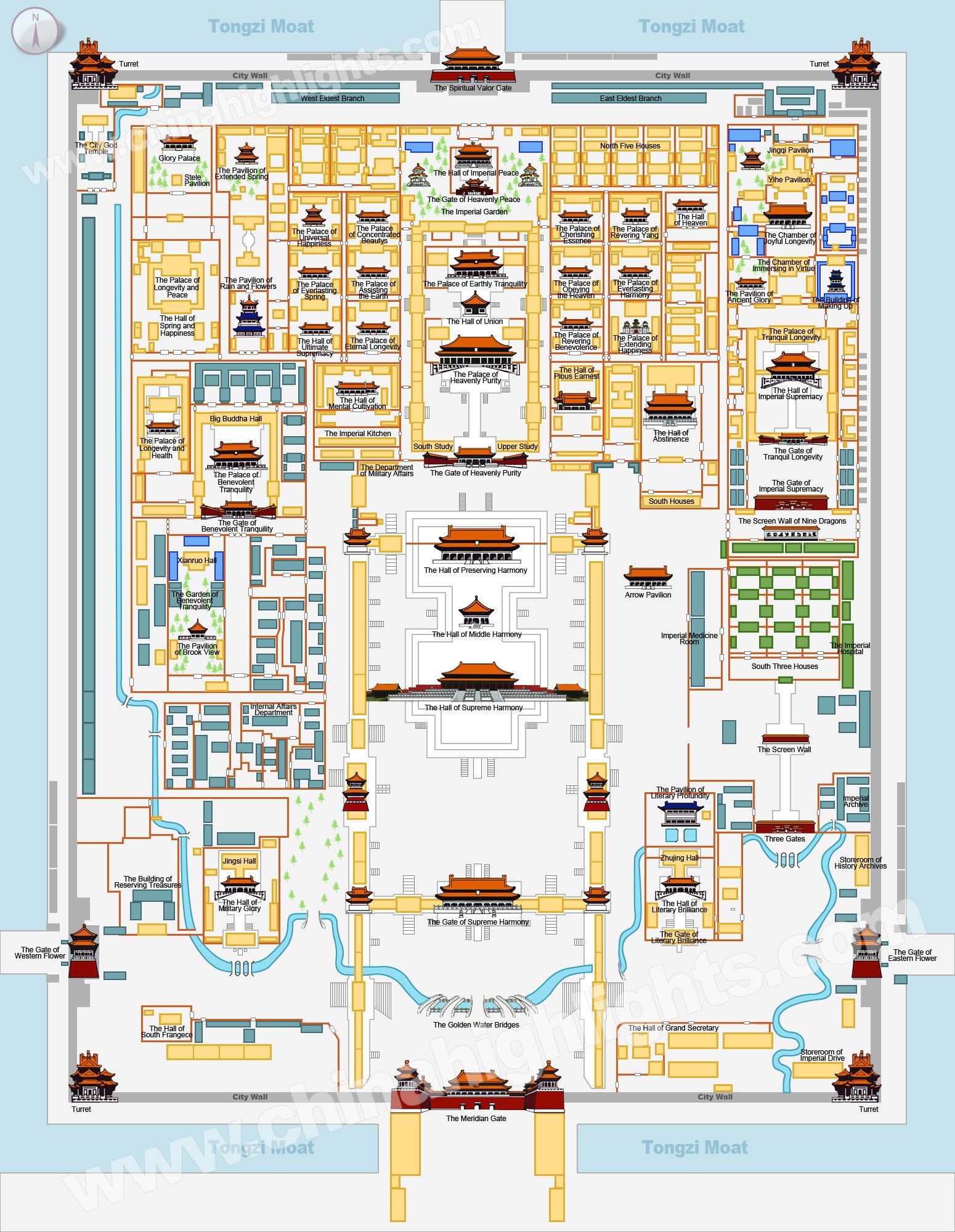 The six halls on the central line of the complex are the most popular and the most important. Most tour groups only go through these six halls plus a visit to the imperial garden at the end of the tour.